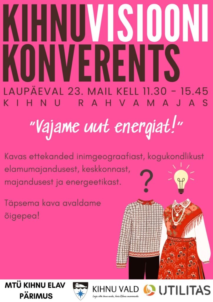Kihnu vajab uut energiat! Oleme varasemalt arutanud, mida teha miljoniga ja kuidas olla säilenõtke, seekord võtame käsile uue energia otsingud. Eesmärgid ei ole muutunud, vaid jätkuvalt on fookuses meie võimekus oma keelt ja kultuuripärandit hoida. Kuigi demograafia ja statistika pole meie poolel, jätkame me omal moel ikkagi kestlikkuse valemi väljatöötamist. Selles protsessis on osalema oodatud kõik kaasteelised!