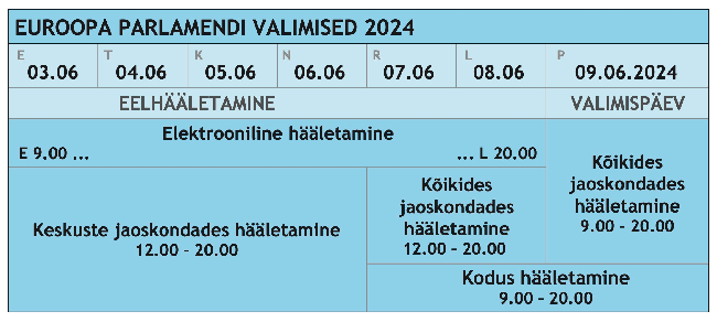 Eelhääletamine ja elektrooniline hääletamine kestab 3.–8. juunini. Eelhääletada saab kuue päeva jooksul igas vallas ja linnas vähemalt ühes valimisjaoskonnas kella 12-20. E-hääletamine kestab esmaspäevast kuni laupäeva õhtu kella 20 välja. E-hääle andmiseks on vaja arvutit, nutiseadmega e-häält anda ei saa. Arvutis omakorda peaks olema kõige uuem ID-kaardi tarkvara, operatsioonisüsteem ja viirusetõrje. Enda tuvastamiseks ja hääle kinnitamiseks on vaja kas ID-kaarti koos lugejaga või mobiil-ID-d. Ka nende kehtivus tasuks varakult üle kontrollida. Smart-ID neil valimistel veel enda tuvastamiseks kasutada ei saa, see võimalus lisandub järgmisteks, 2025. aasta kohalikeks valimisteks. Valijarakendus, millega e-hääletada, on kättesaadav veebilehelt valimised.ee, kust see tuleb oma arvutisse laadida. Rakendus on kättesaadav ainult valimised.ee lehelt, kuskilt mujalt seda kindlasti alla laadida ei tohiks.
