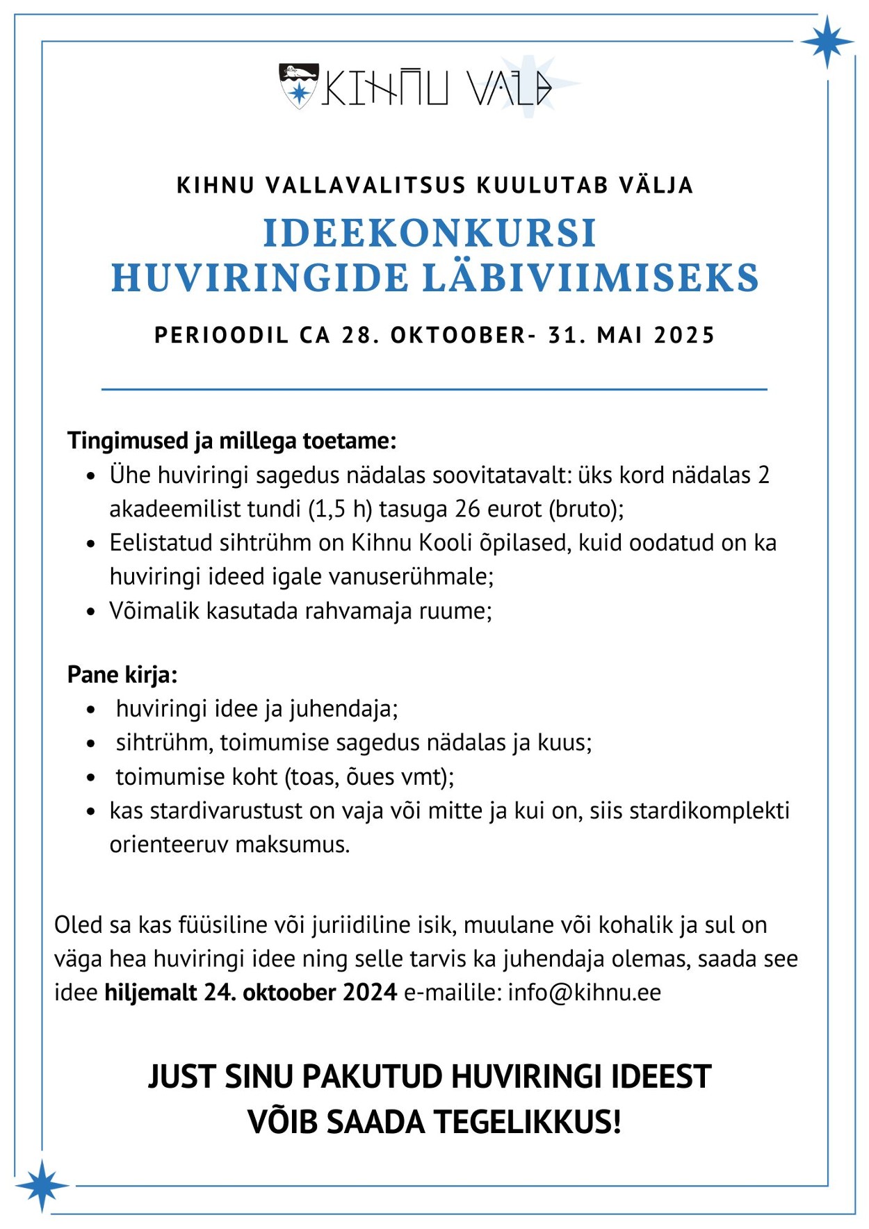 Kihnu Vallavalitsus kuulutab välja ideekonkursi huviringide läbiviimiseks perioodil ca 28. oktoober- 31. mai 2025