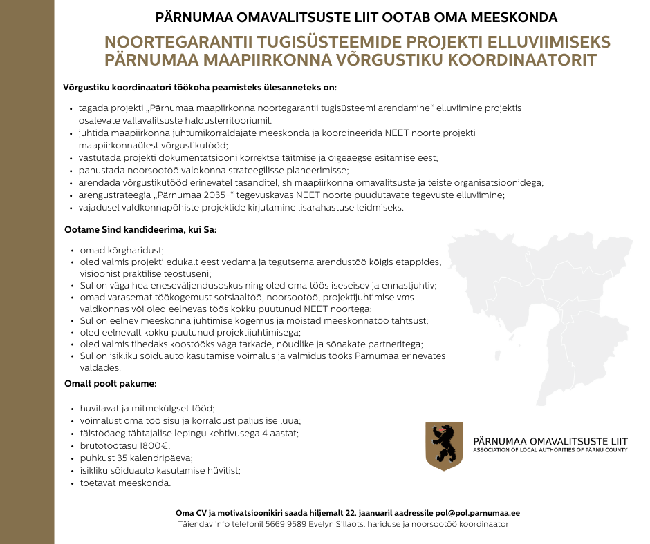 Pärnumaa Omavalitsuste Liit ootab oma meeskonda NGTS koordinaatorit ja nelja juhtumikorraldajat.