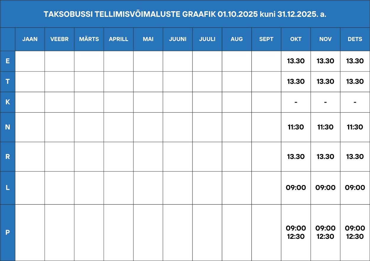 Taksobussi tellimisvõimaluste graafik 01.10.2025 kuni 31.12.2025.a.