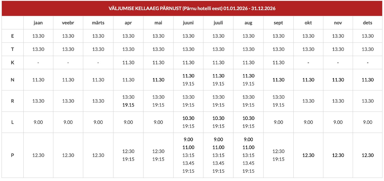 Teenindab OÜ Pärnu Takso, telefonil 1222 või 443 9222. NB! Väljumine Pärnu hotelli eest.
