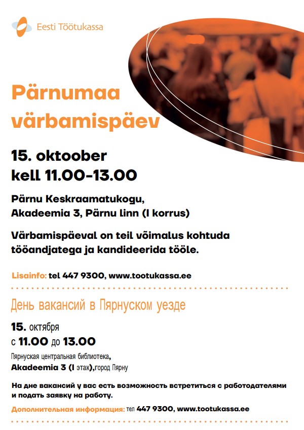 Töötukassa korraldab Pärnumaa töötutele värbamispäeva, mis toimub teisipäeval, 15. oktoobril 2024 kell 11.00-13.00 Pärnu Keskraamatukogus.