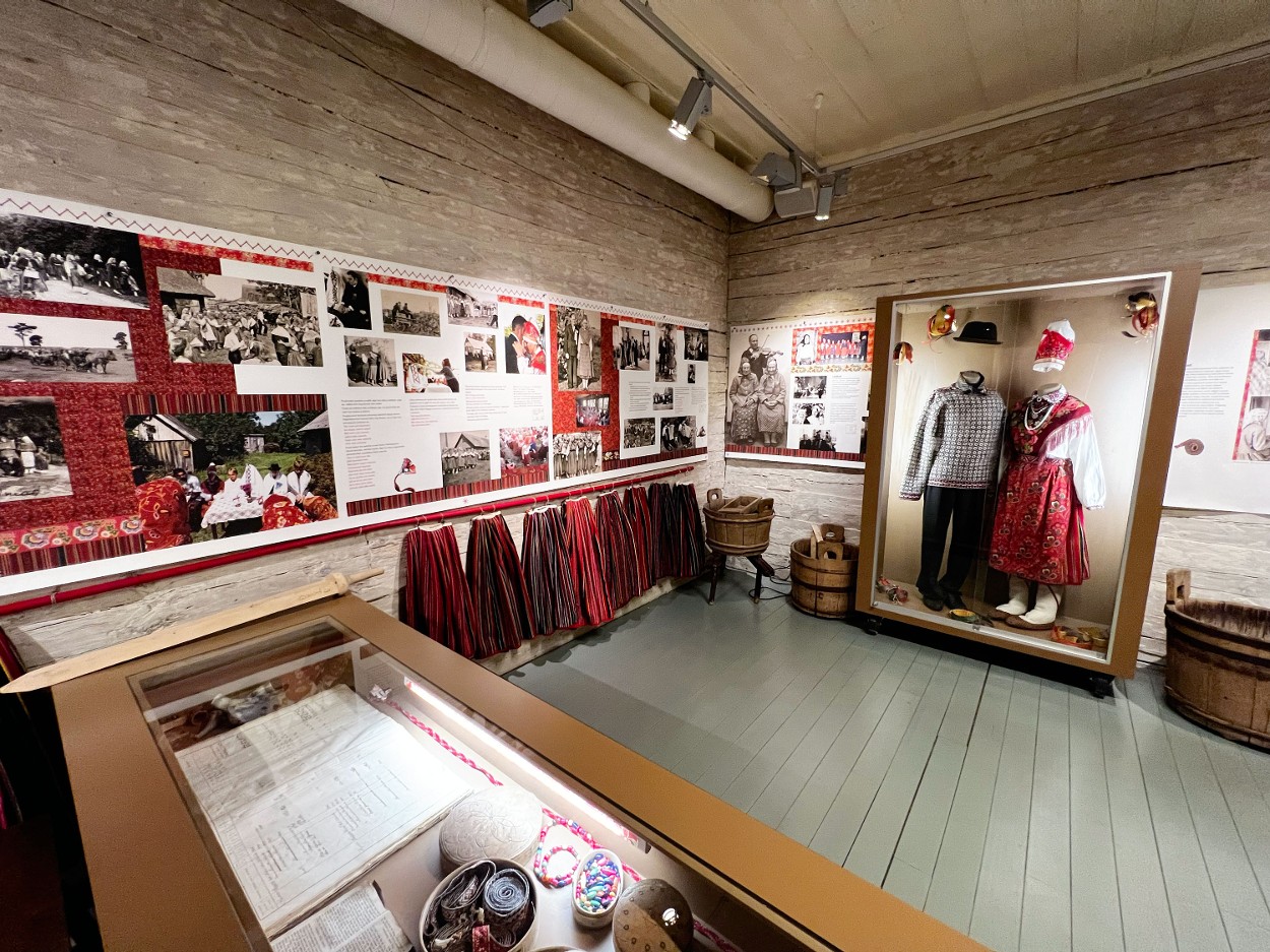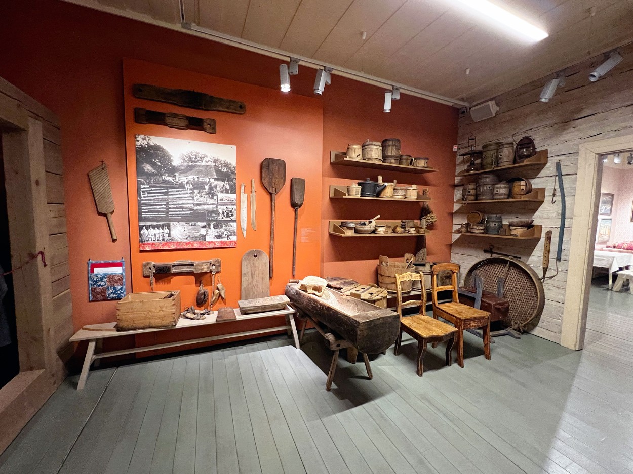 Järgmises ekspositsiooniruumis on aidavitriin koos ääreni täis kirstudega ja käsikamber koos kõikmõeldavate talupidamises vajaminevate nõude ja riistadega. Ekraanil näidatakse erinevaid töid talus, põllu peal ja heinamaal.